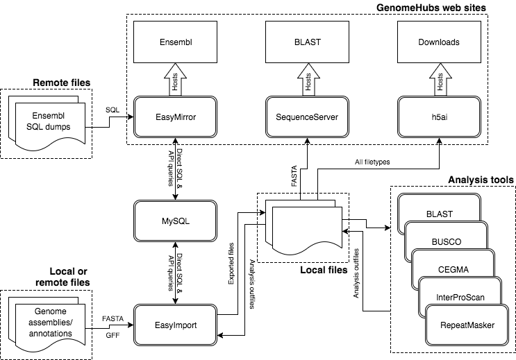The full set of GenomeHubs Docker containers also includes tools to export data from Ensembl databases into standard file formats, and containers to run analyses on these files that can be imported back into Ensembl database format for display alongside the sequences and gene model data: